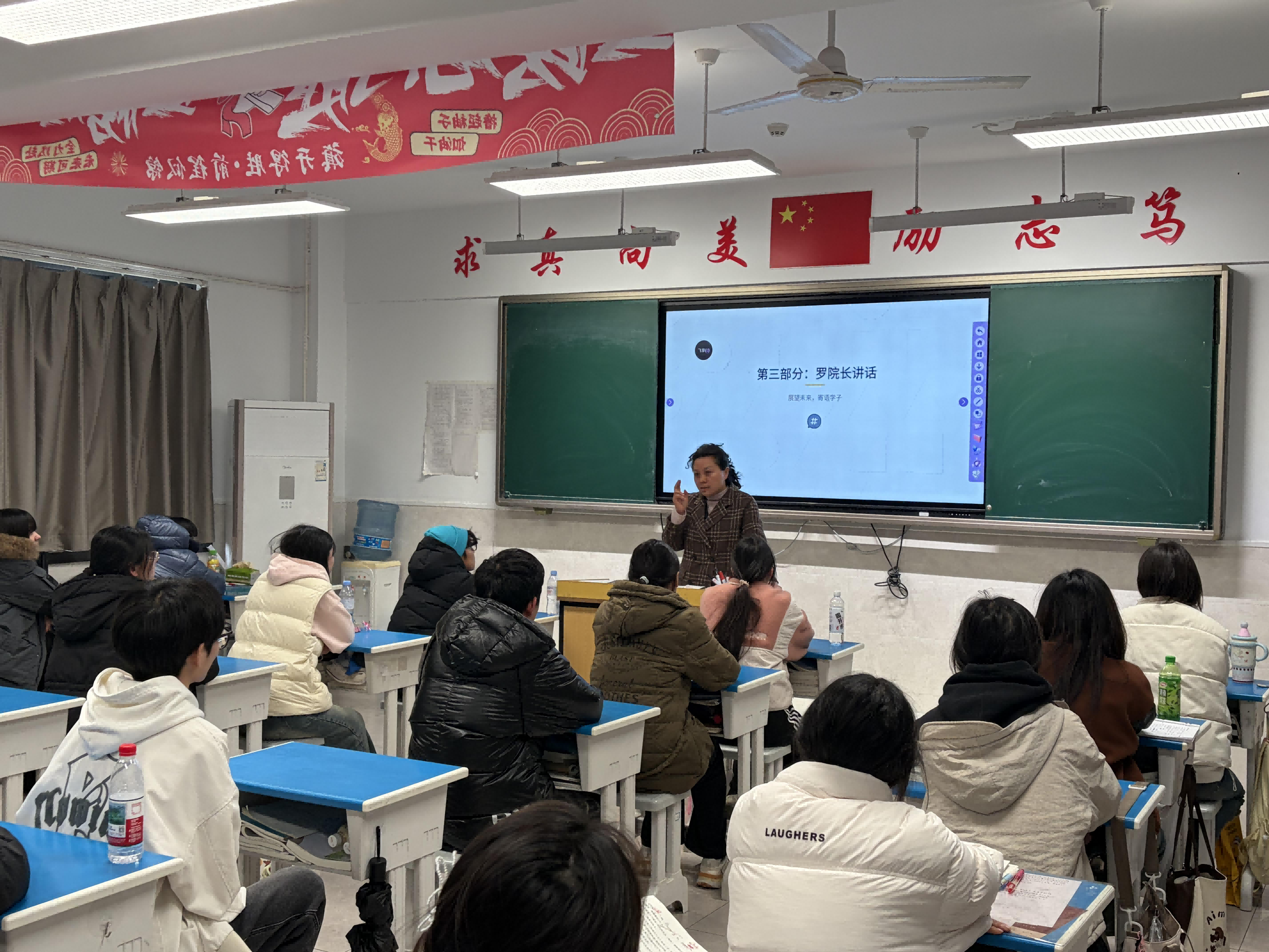会议最后,罗俊副院长发表殷切寄语,向全体学生寄予殷切期望。她表示,学院与全体教师始终是同学们高考路上最坚实、温暖的后盾,坚信每位学生都蕴藏着无限潜力。她希望同学们不负青春韶华、不负师长的悉心教诲与家人的殷切期望,坚定备考信念,以饱满的热情、昂扬的斗志、科学的方法全力冲刺最后30天,为自己的理想与未来放手一搏,在2026年职教高考的考场上书写属于自己的精彩答卷。