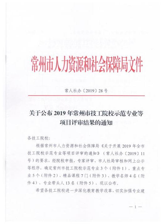 2019年常州市技工院校重点专业等项目评审结果的通知