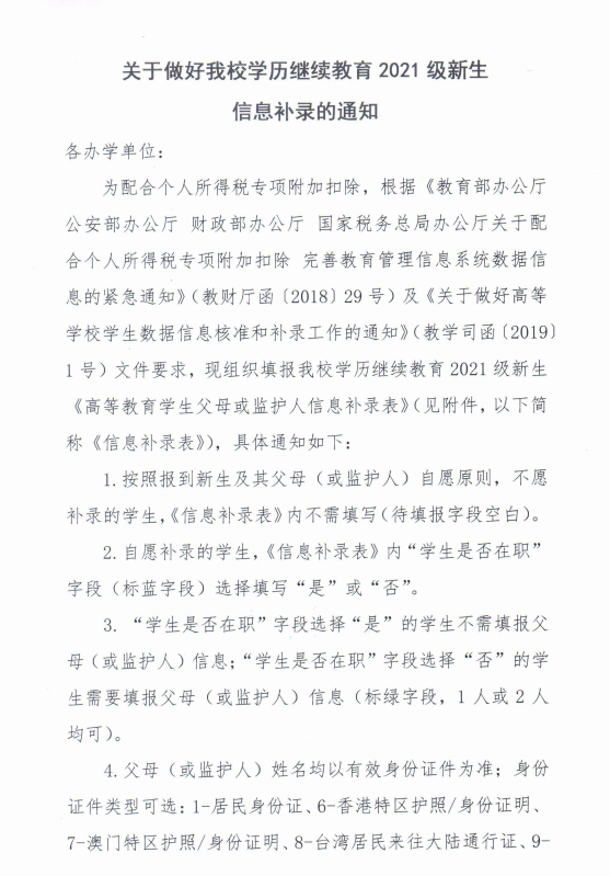 转-关于做好我校学历继续教育2021级新生信息补录的通知