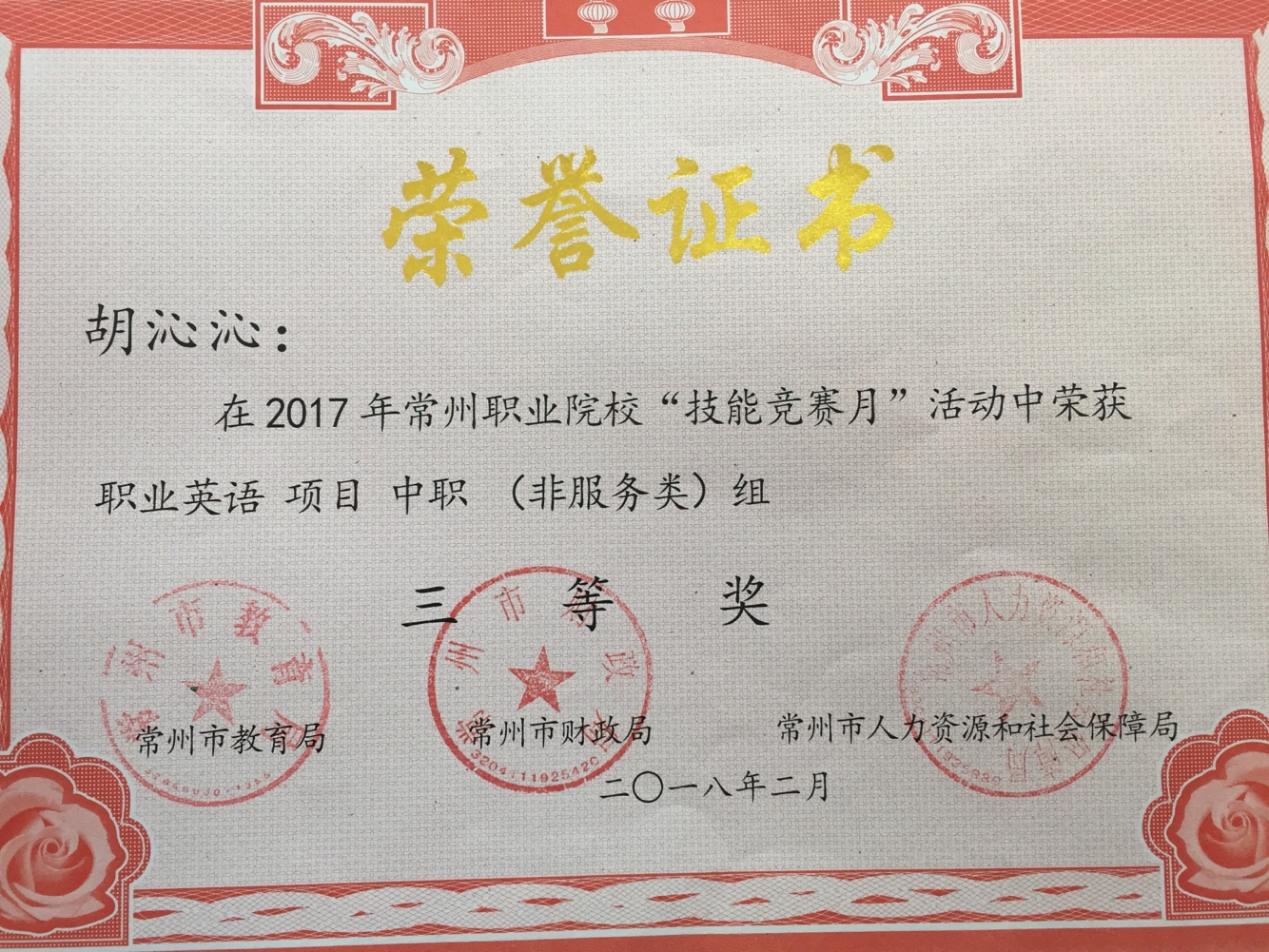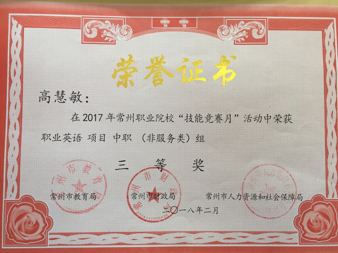 2017年11月14日年我院首次参加“常州职业院校技能竞赛月”职业英语项目(中职组)比赛,高慧敏、胡沁沁两位同学分别荣获三等奖。
