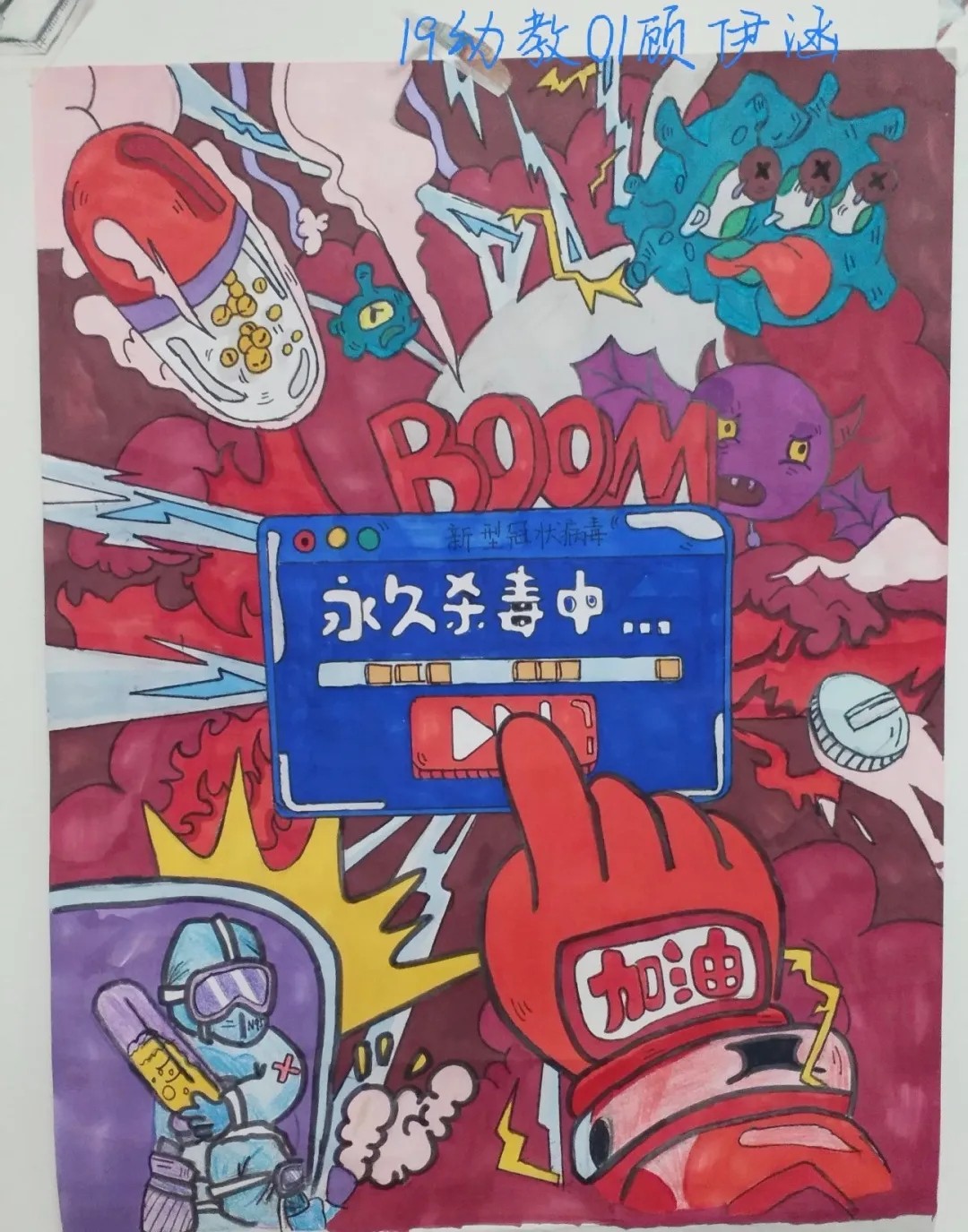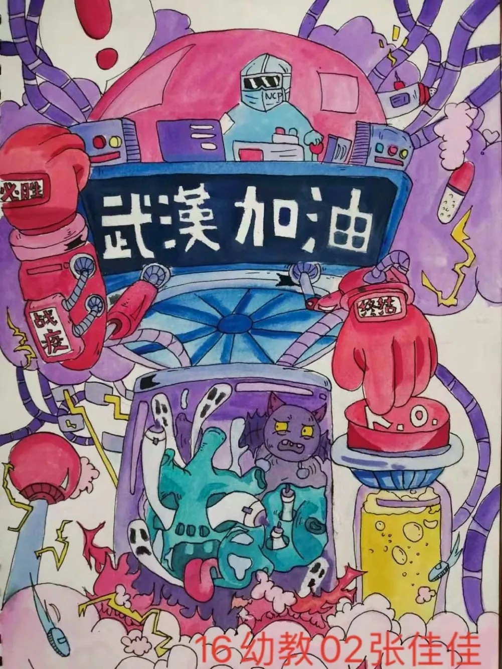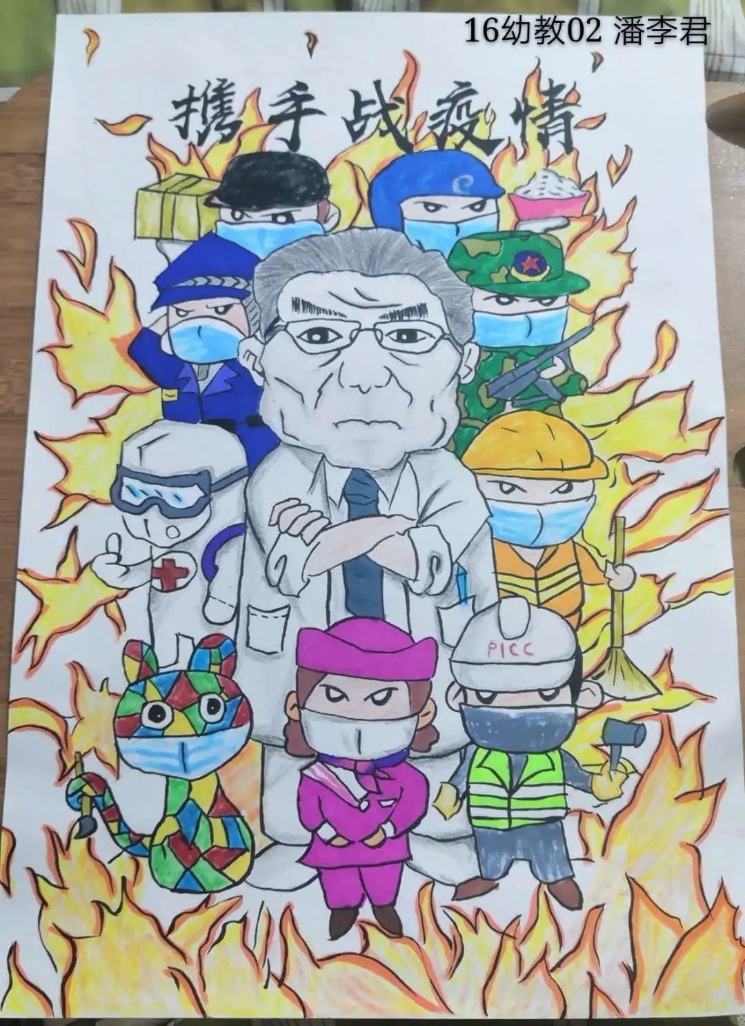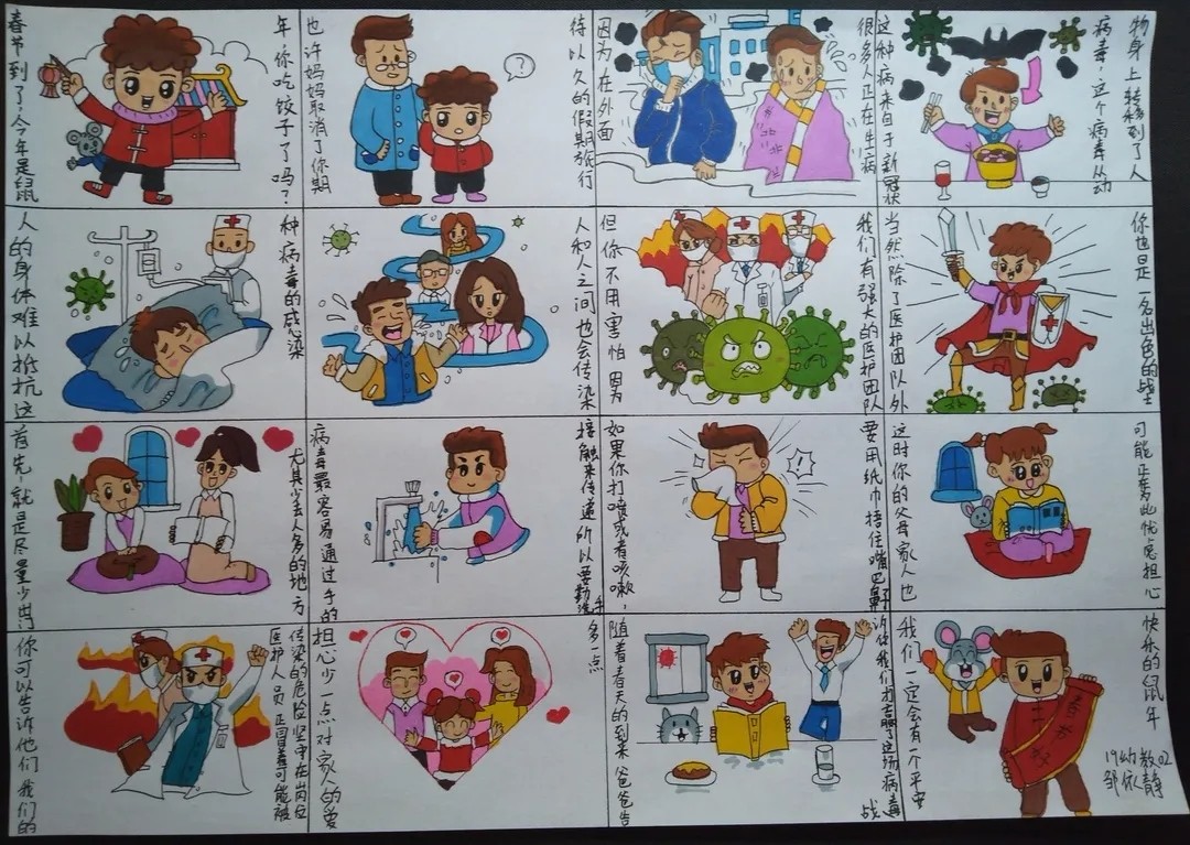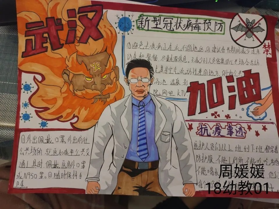我是来自18幼教04的张静,现是一加爱心社龙城小明团队的一员。在2020年的一开始,本应该一切都世阖家团圆的日子,却因为一场疾病的到来而发生了改变,一切都由动而变成了静。许多医务人员不顾自己的生命危险,挺身而出,在第一线与病魔战斗着,而我作为一名志愿者,在队长李明的代理下,也参加了抗议防疫的战争,在公交车上帮助了乘客量测体温等,贡献出了自己的一份力量。我为我自己贡献出一份力量而感到高兴。非典时期我还是个未经世事的孩子,所以生死国事感觉离我很遥远,这次疫情从第一时间起关注,看到了人生苍茫如白驹过隙,和平年代家国情怀中闪耀人性的一切美好,愿一线的医护人员平安归来,所有还在岗位保障人民日常生活牺牲个人利益的人们,一起加油。@18幼教04的张静把最美的祝福送给战斗在抗击新型冠状肺炎一线的医护人员、安保人员、保洁员,以及所有为打赢防疫攻坚战付出的人们;送给武汉市民,你们以高度的自我奉献精神配合“封城”,为防止疫情扩散做出牺牲;送给所有关注和支持抗击疫情的人们,祝你们身体健康,新春快乐,鼠年吉祥!众志成城,必将战无不胜。武汉,我们永远在一起,加油! @16数车01--李志 一幅幅战“疫”作品