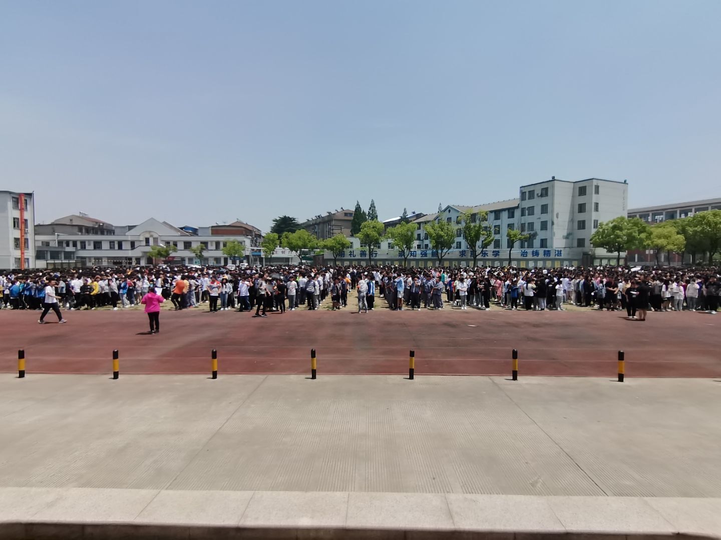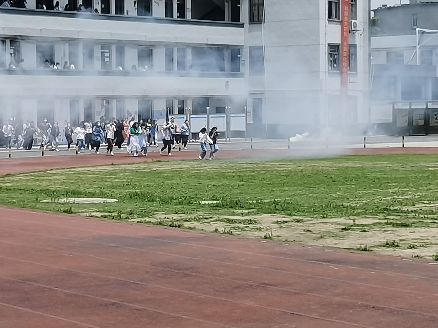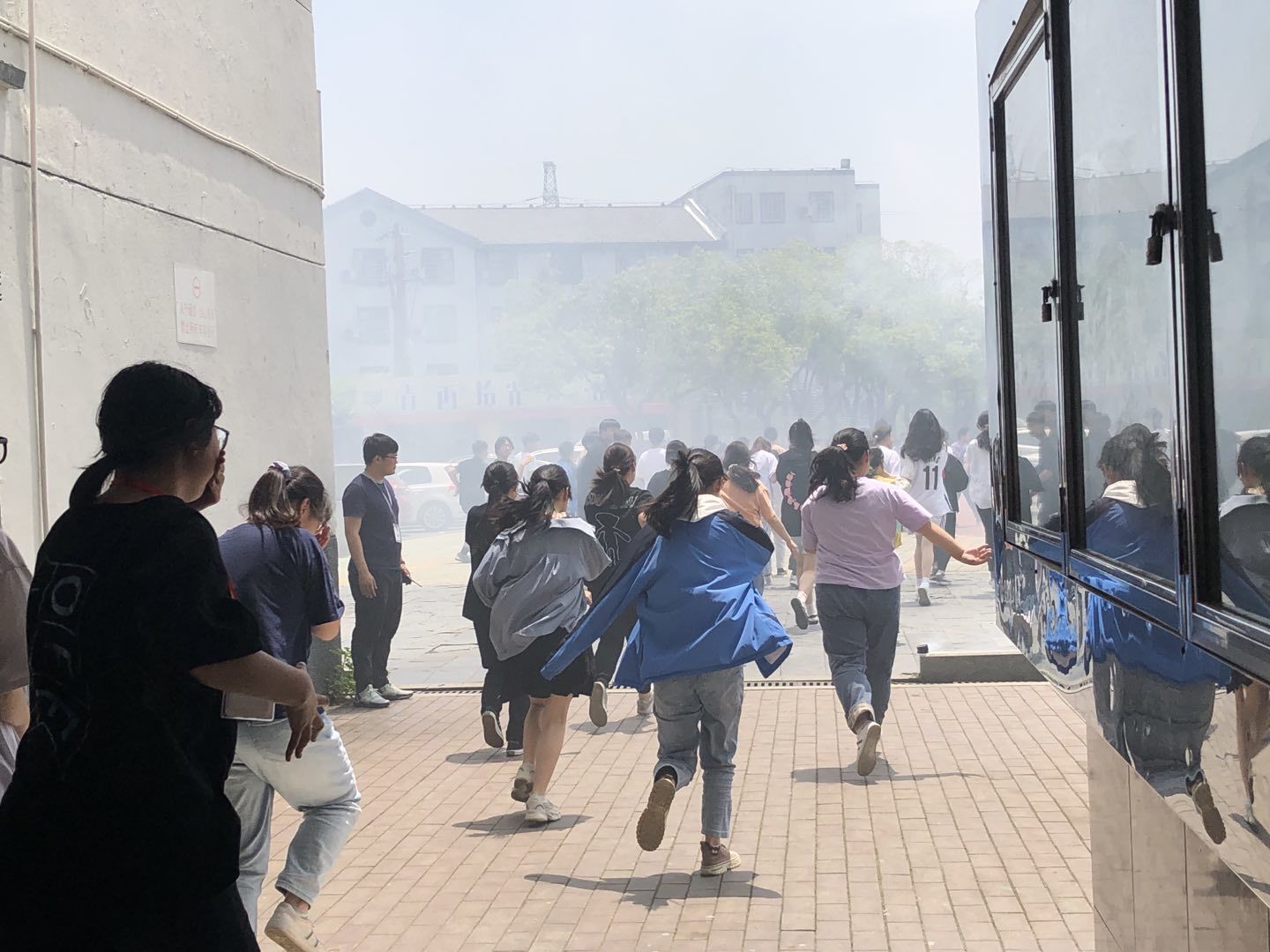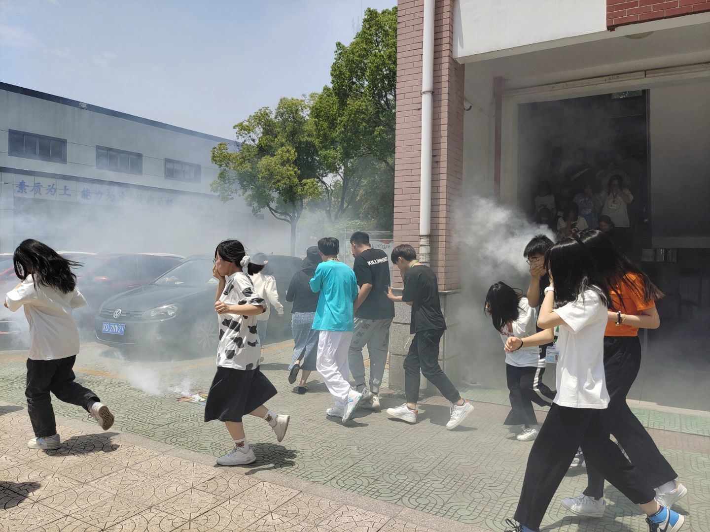 学院于下午12:20开展逃生演习,假设在教学楼发生消防事件或地震等自然灾害时进行紧急疏散,让师生通过演习熟悉逃生的线路,防患于未然。每位学生在老师的指导下,有序逃生。