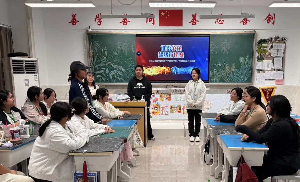 班会中还特别设置了班级辩论赛环节,辩题为:“养成文明习惯,守护美丽校园:主要靠自律还是他律?”